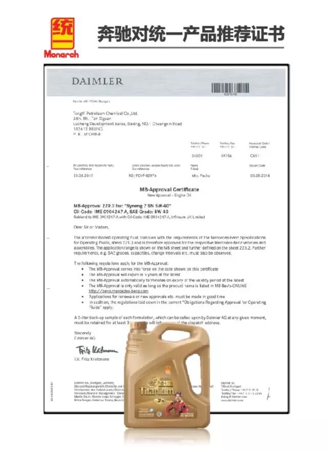 统一润滑油旗下钛合能7系全合成润滑油,获得戴姆勒奔驰认证 ,这也是统一继钛合能8系后再次获得戴姆勒奔驰认证。