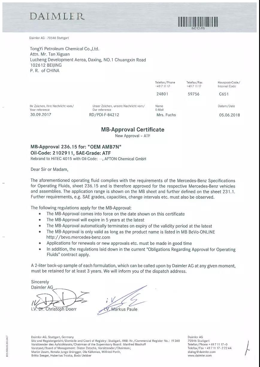 统一石化两款产品经过严格测试后,正式获得德国奔驰公司MB236.14和MB236.15两项自动变速箱认证。