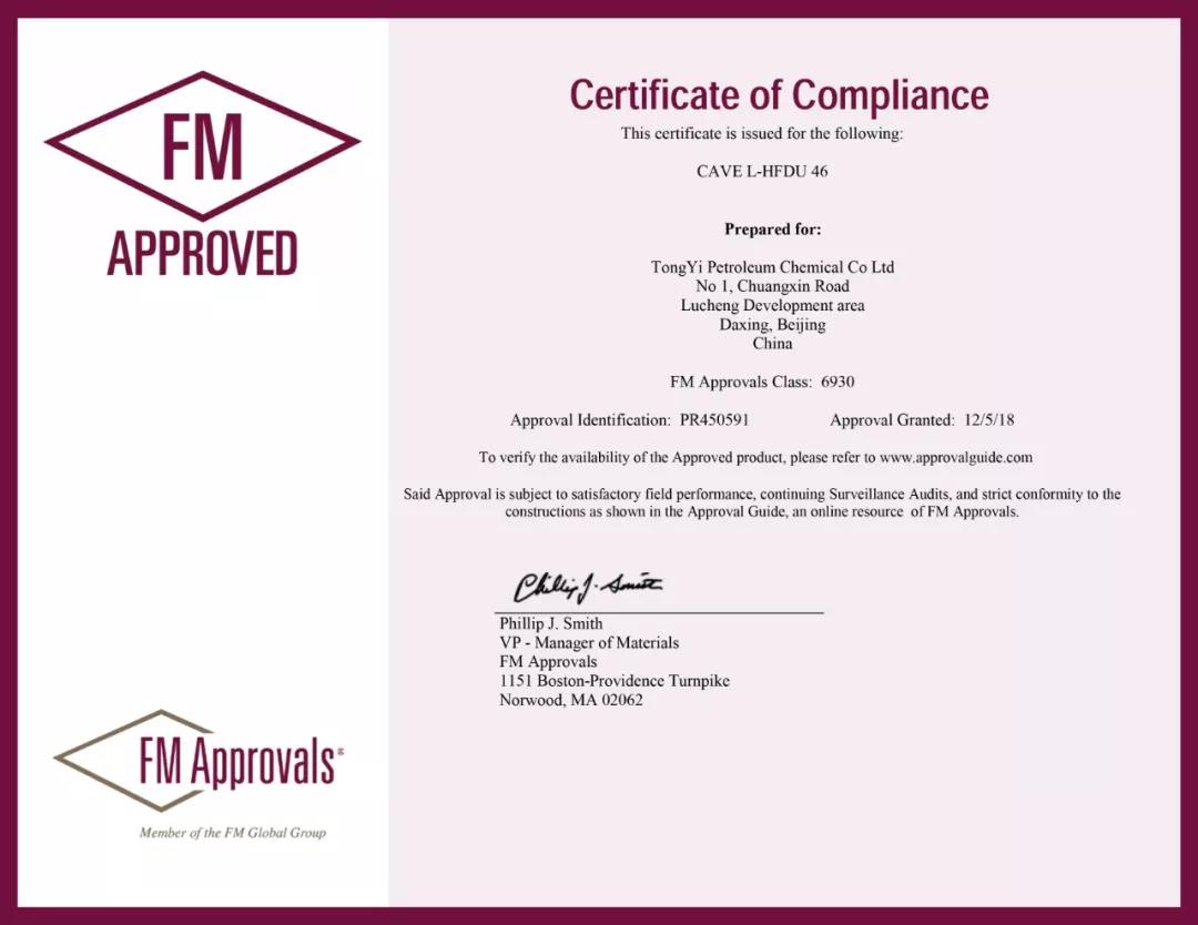 统一加威合成酯型难燃液压油喜获美国FM机构火险认证,并成为FM中国区唯一获得此认证的中国品牌与产品。
