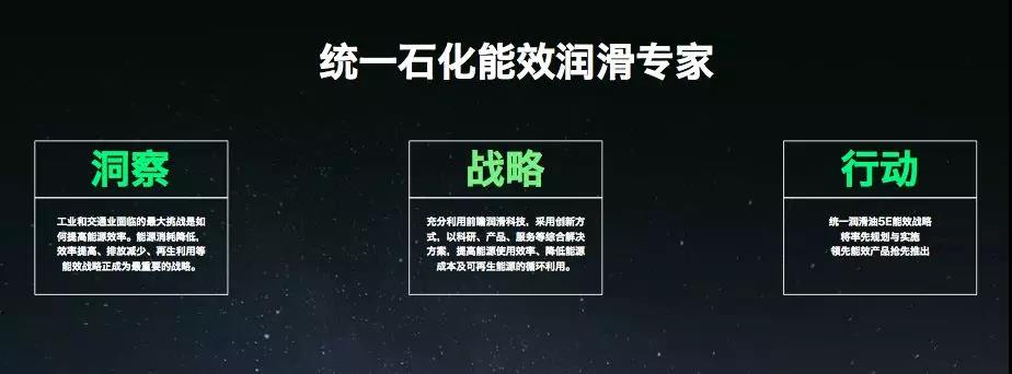 为了实践5E能效润滑理念,统一润滑油早已从技术、产品、商业模式、服务等4大方面发力部署。