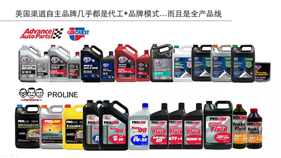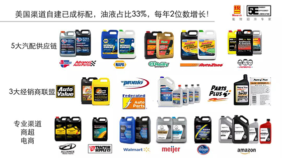 在美国,所有的主流渠道都有自己的油液品牌,渠道品牌占美国油液市场消费的33%,每年还以两位数增长。无论是5大汽配供应链,3大经销商联盟,还是专业渠道/商超/电商,大多都有自己的品牌。
