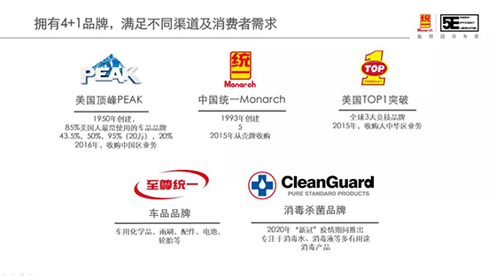 在底层持续驱动5层业务协作体系的,正是统一的品牌实力。统一现有4+1品牌,包括统一润滑油、美国顶峰PEAK、美国TOP1突破、至尊统一车品品牌、CleanGuard消毒杀菌品牌等,满足不同渠道及消费者需求。