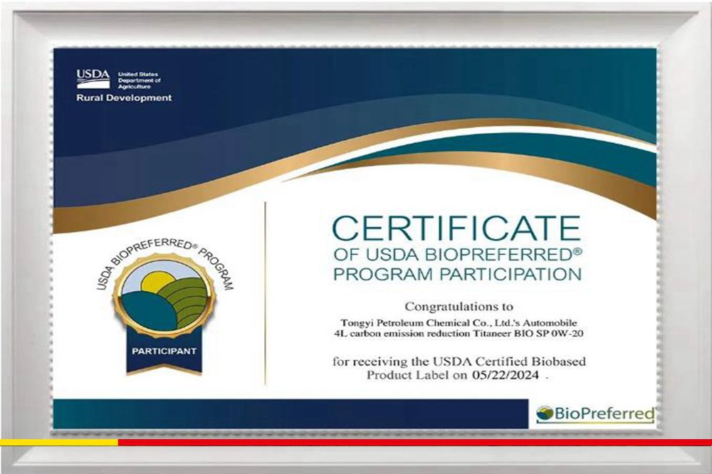 在全球绿色能源与可持续发展趋势中,统一石化再次站在创新与责任的前沿。近日,由低碳战略品牌统一创新研发的生物基机油解决方案再次斩获美国农业部(USDA)的生物基产品认证,这是继ECO SP 0W-20生物基含量达89%之后取得的又一次成果。 作为低碳润滑领域的急先锋,31年来统一始终致力于