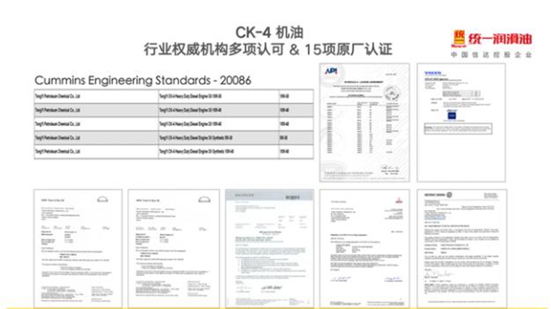 为顺应国六时代,统一润滑油率先推出的CK-4系列柴机油还获得了国内外市场的高度认可,并陆续获得了康明斯、MAN、道依茨、奔驰、沃尔沃等国内外知名汽车制造商和美国石油协会(API)的认可。截至目前,统一润滑油CK-4系列柴机油已经成为各大商用车品牌,以及各行业协会极力推荐的润滑油产品,这也足以印证了统一润滑油在整个行业中的领先地位。