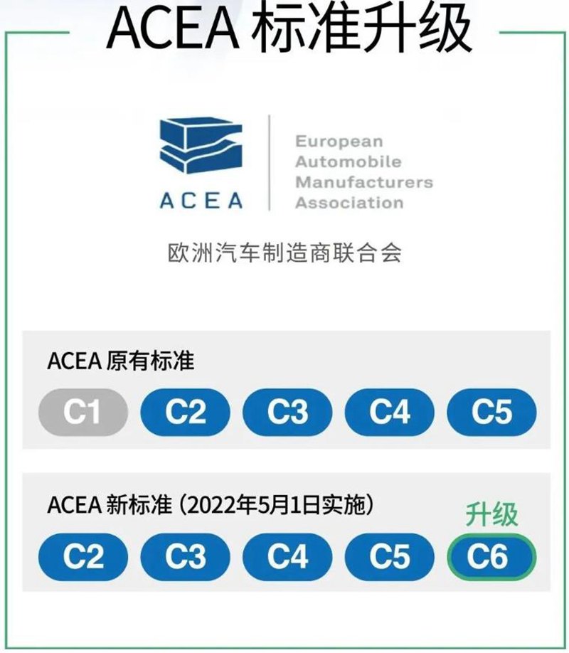 ACEA C6标准是ACEA-2021版本最新增加的一个标准,增加C6标准的同时剔除了C1标准,C6可以说是C5的升级版。
