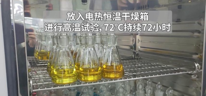 看到这里,有车友可能会表示疑虑,觉得有点不可置信。关于这一点,统一T-lab润滑科技实验室也是随机抽取三种在市场上销售的主流液压油经过实验对比过的,已证实统一中国杯3.5L全兼容HM液压油可以与其他品牌的液压油充分混合。其次,统一还对该款产品做了耐高温实验,即将油品放入72℃的电热恒温干燥箱中,持续72小时,进行高温工况测验,经过三组测试对比,证实统一中国杯3.5L全兼容HM液压油能与其他三种主流液压油完全兼容。