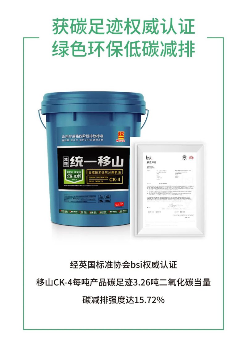 不仅如此,统一移山CK-4全合成低灰分柴机油的品质还获得了国际权威第三方机构bsi的认可,成为国内非道路工程润滑领域中为数不多能获得此项殊荣的润滑产品。据悉,每吨移山CK-4柴机油的二氧化碳当量为3.26吨,碳减排强度为15.72%。