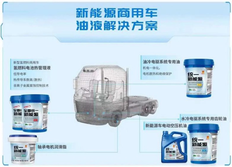 在我国“双碳”目标战略背景下,统一润滑油也率先提出了自己的低碳战略,针对新能源商用车领域,打造了包括锂电池热管理液、氢燃料电池热管理液、电机轴承润滑脂、电动空压机油、油冷/水冷电驱系统专用油在内的众多高质量产品,推出可适用各类新能源商用车使用的五大解决方案,为我国碳减排发展贡献力量。