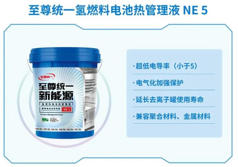 至尊统一氢燃料电池热管理液NE5,该产品拥有零碳排放量及长距离的使用优势,在客车和商用车领域,氢燃料电池应用的十分广泛,该电池工作过程中极易产生热量,在散热方面的要求很高,如果不能给予更好的散热,电池的效率及寿命都会受到影响。至尊统一氢燃料电池热管理液NE5采用统一核心科技原料,不仅拥有良好的散热性能,还拥有优秀的绝缘特性,可大大降低漏电带来的安全风险,全面提升电池的效率。