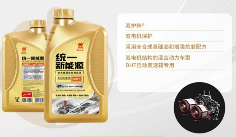统一全合成混动变速箱油DHTF,是统一润滑油针对新能源混合动力车型打造的一款专用产品,采用全合成基础油及高强度抗磨配方,大幅提升了产品的抗磨损性能,可为双电机结构的混合动力车型DHT自动变速箱提供更优保护。