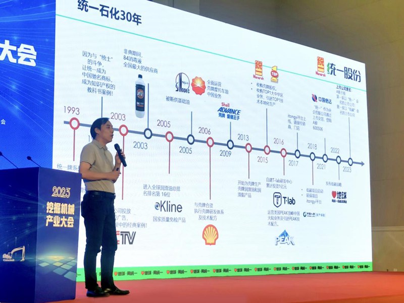 近日,主题为“数智高效绿色发展”“2023挖掘机械产业大会”在北京顺利举行,该会议是由中国工程机械协会挖掘机械分会等联合主办的行业盛会,旨在携手行业企业共建高质量、可持续发展的挖掘机产业生态链。会议现场专家学者如云,统一技术服务总监韩江涛应邀出席并发表了主题演讲。在演讲中,韩总从市场发展趋势、非道路工程领域四阶段排放技术要求以及对机油产品的挑战、统一低碳技术产品优势等多个维度进行了深入分析和重要分享。