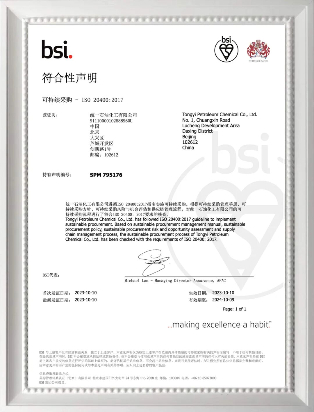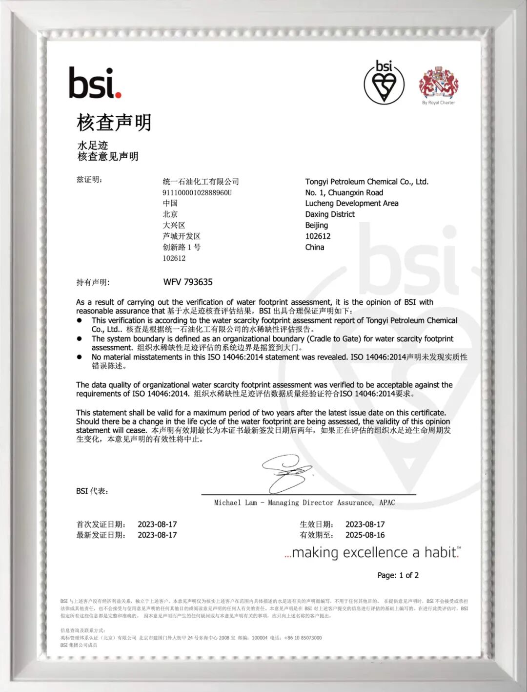 作为对统一绿色生产力体系的认可,国际知名认证机构BSI于2023年12月为统一先后颁发的中国大陆地区第一张ISO20400可持续采购符合性声明和ISO14046水足迹核查意见声明,表明统一在热管理领域建立了以协同化降碳减排为核心的绿色供应联盟体系。