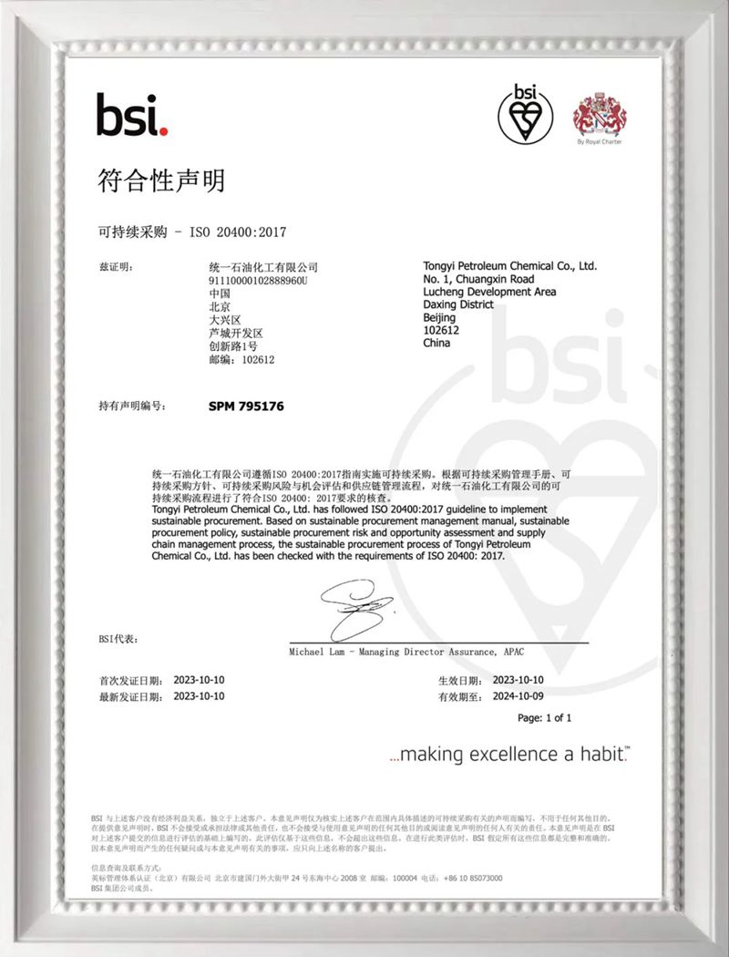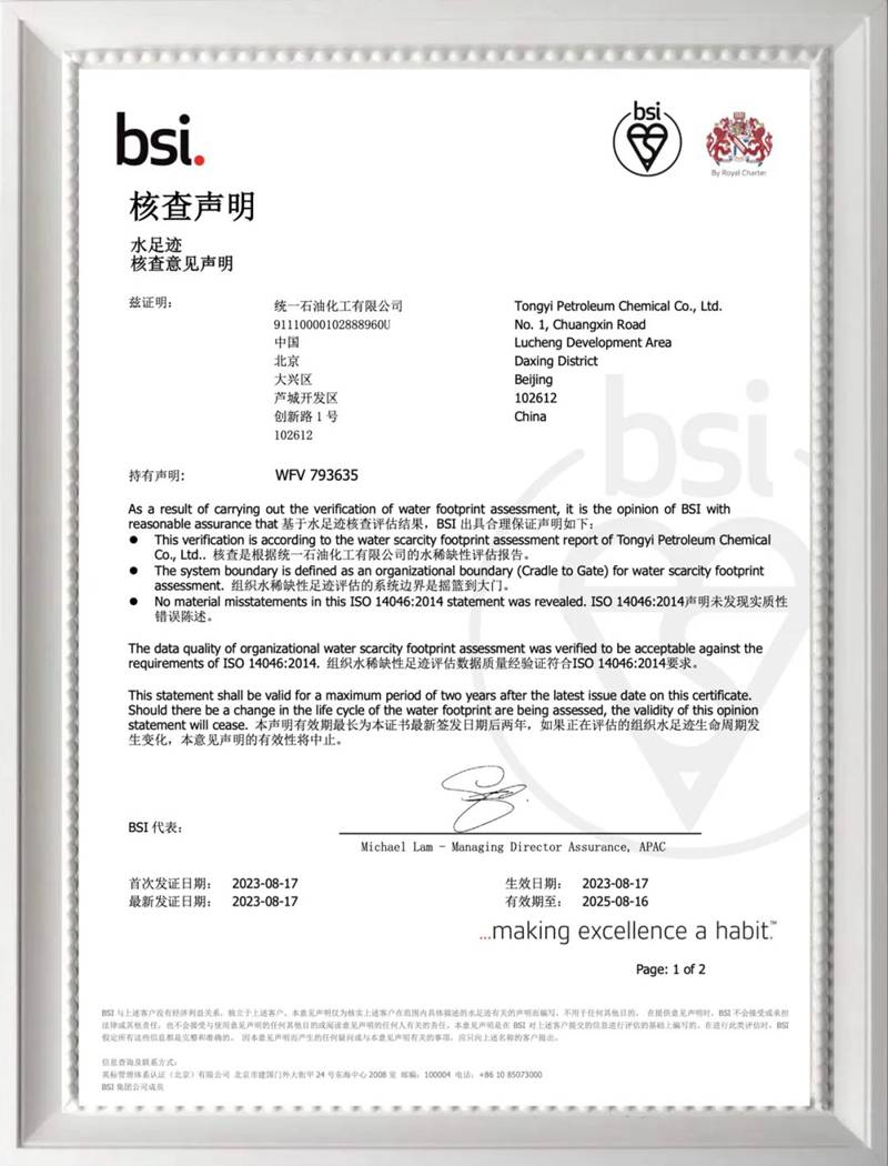 值得关注的是,统一石化已经率先获得了由bsi颁发的中国大陆地区首张ISO20400可持续采购符合性声明和ISO14046水足迹核查意见声明,获得该认证后足以表明统一已经在热管理领域建立了协同化的降碳减排绿色供应联盟体系,同时也表明统一绿色生产力建设已经完成。