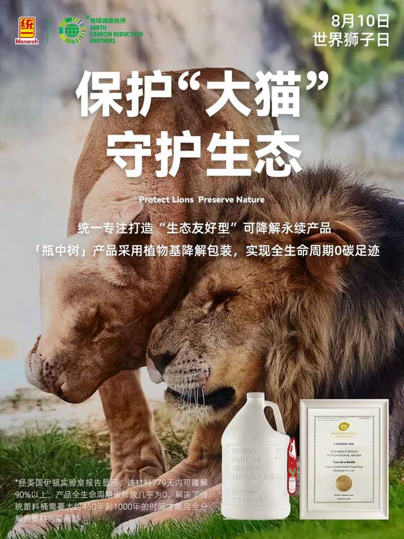 首先,在包装上,统一瓶中树机油采用100%植物基可降解包装。要知道,传统塑胶包装在自然环境中需要数百年甚至上千年才能降解,大量塑胶垃圾不仅污染土壤、水源,还会通过食物链影响草原生态——比如小型动物误食塑胶碎片后死亡,狮子的猎物数量也会随之减少。而统一的植物基包装,从源头上减少了全新塑胶的产生,避免了塑胶污染对狮子栖息地的破坏。更令人安心的是,这种包装在779天内可降解90%以上,全生命周期碳排放几乎为0,不会加剧温室效应导致草原干旱,为狮子保留了湿润、肥沃的生存环境。