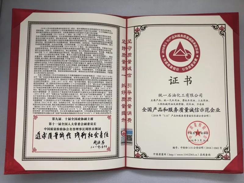 连续三年荣膺“全国产品和服务质量诚信示范企业”称号,统一石化凭借的,是坚持对质量安全精益求精的精神,坚持对消费者权益的保护与无限尊重,坚持对经销商利益的用心保护。