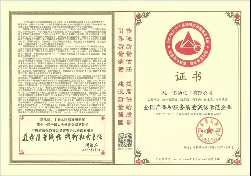此外,2017年,统一荣获“2017中国润滑油行业质量领军企业”及“全国质量信得过产品”称号。