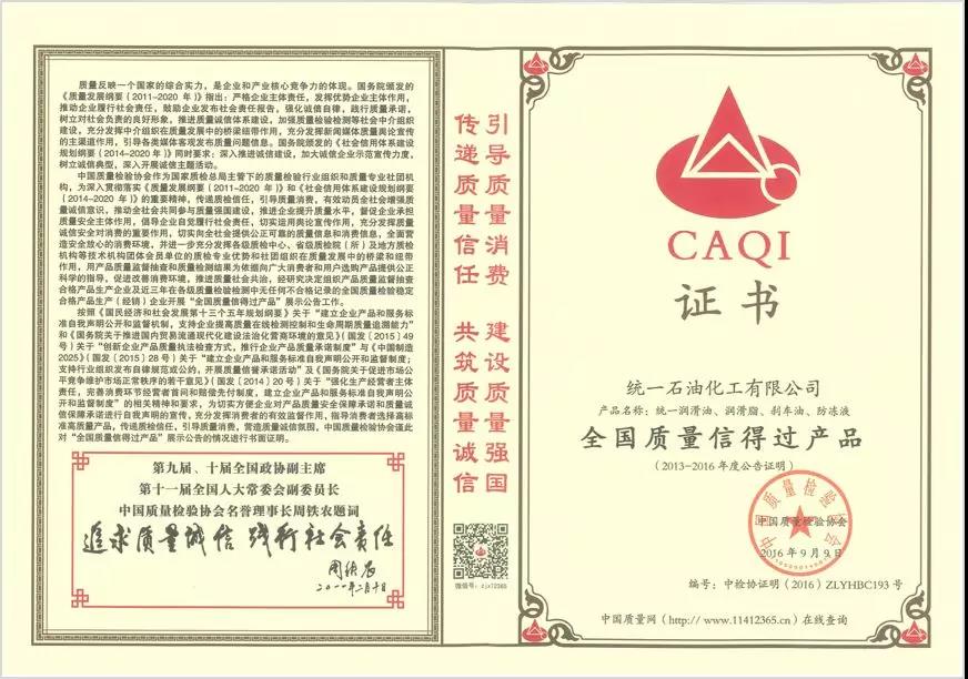 2016年,统一获“2016全国润滑油行业质量领军企业”、“2016全国质量信得过产品”、“中国质量检验协会团体会员单位证书”等。