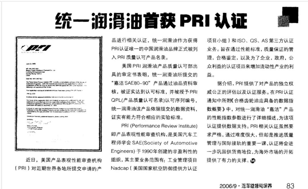 早在2006年,统一润滑油就通过油品资料审核,被证实达到认可标准,并被授予PRIQPL(产品质量认可名录)认可序列编号,是当时获得PRI认证唯一的中国润滑油品牌。而这次时隔12年后再次通过更为严格的J2360标准认证,将进一步巩固统一的行业地位,为客户服务提供了坚实而有力的技术支撑。