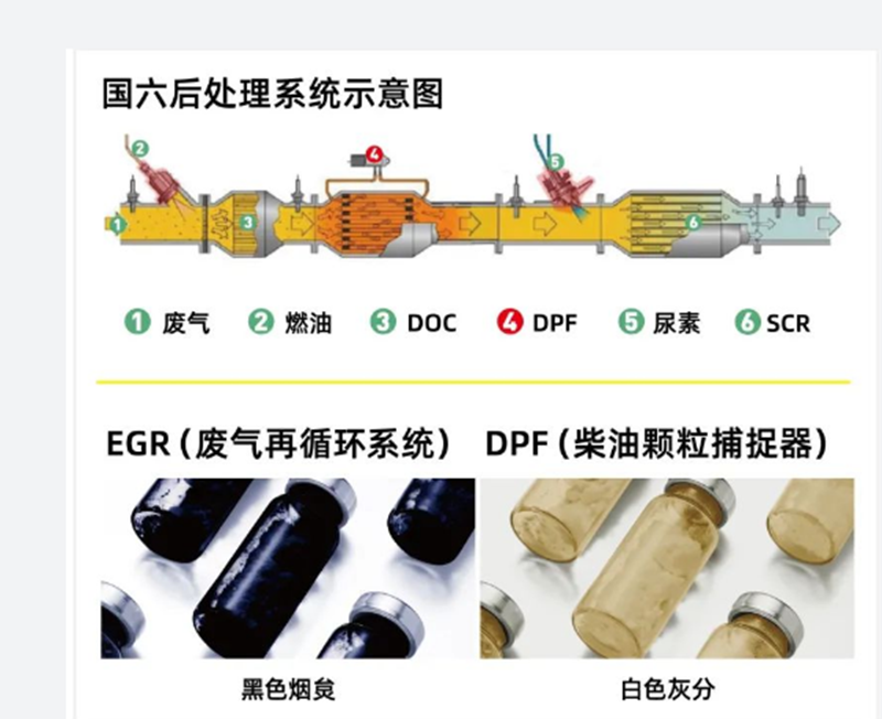 首先我们来看一下国六商用车发动机和其他排放发动机的硬件上的区别。我们知道为了满足国六排放要求,很多的国五车辆都增加了DPF颗粒捕捉器,其作用就是将柴油车尾气中不能完全燃烧的颗粒物过滤掉,使排放的尾气达标。因此,这个装置现在已经成为了国六商用车型出厂的标配。对于安装了DPF颗粒捕捉器的车辆,各OEM给出的保养要求是需要使用低灰分技术配方的机油,这样才能有效降低颗粒物的排放,减少对DPF的损坏。于是在此前提之下,专门应对国六发动机保养的API CK-4机油应运而生。