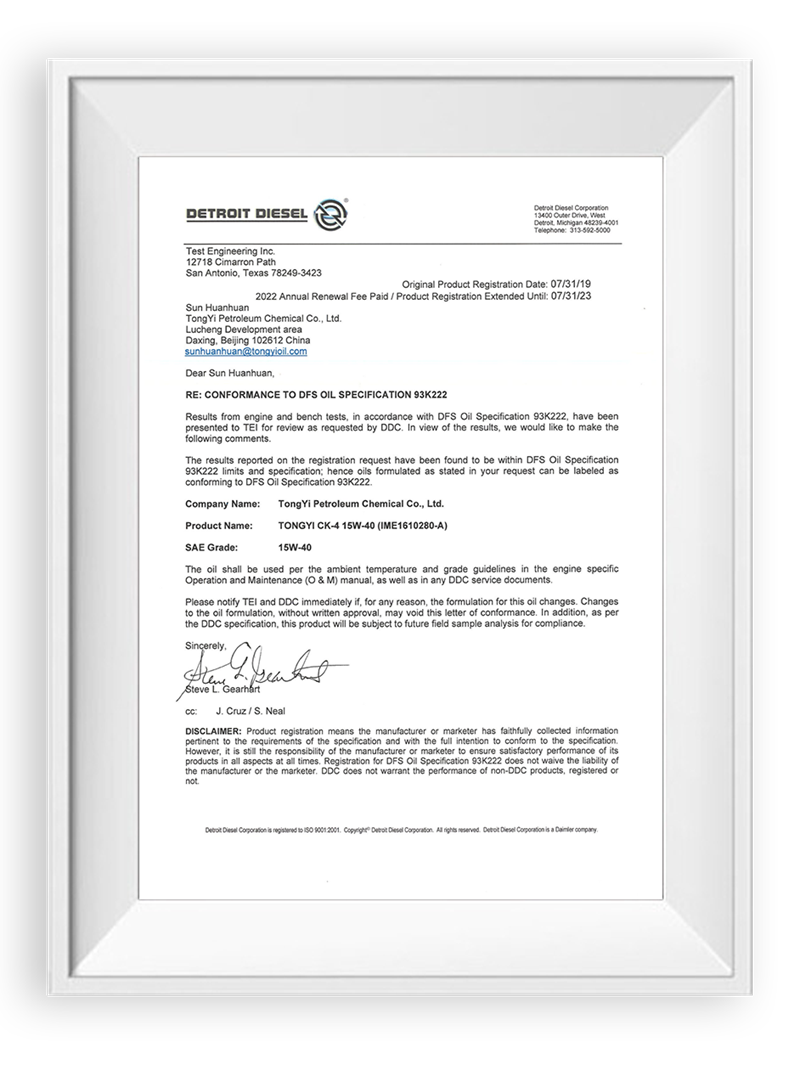 近日,统一钛粒王T7 CK-4 15W-40,获得美国底特律DFS 93K222认证!美国底特律柴油机公司(DDC)为美国军用柴油机最大供应商,该公司在产品研发、生产销售和售后服务方面均为世界一流,在发动机和发电机市场享有盛誉。作为世界级的柴油发动机之一,其认证标准极为严苛,所出具的认证也有着业界公认的权威地位。