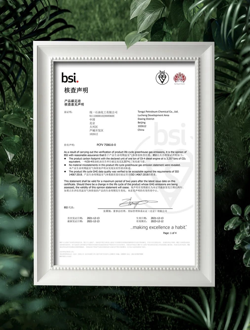 经过英标协会bsi碳足迹认证,1吨钛粒王T7 CK-4柴机油从摇篮到坟墓的碳足迹为3.257吨二氧化碳当量,可有效减碳15.72%。经测算,钛粒王T7 CK-4可综合节油1.2%,有效提高燃油经济性,更节省。再次获得底特律柴油机认证,表明统一钛粒王T7 CK-4柴机油获得更广泛、更严苛市场的认可。统一也会依托于T-lab低碳润滑研究院的先进科技,持续产品创新,探索更有效的行业低碳润滑解决方案。