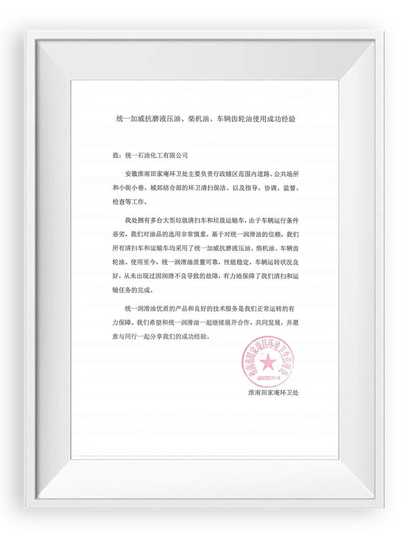 安徽淮南田家庵环卫处表示:“统一润滑油优质的产品和良好的技术服务是我们正常运转的有力保障,我们希望和统一润滑油一起继续开展合作,共同发展,并愿意与同行一起分享我们的成功经验。”