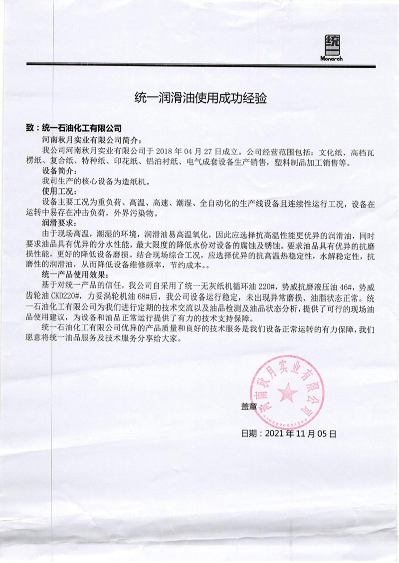 在造纸行业中,统一润滑油出色的产品及专业的技术服务,收获了来自河南秋月实业有限公司的高度认可。该企业主要以生产高档瓦楞纸、复合纸以及文化纸等各类纸品的高产能造纸企业。