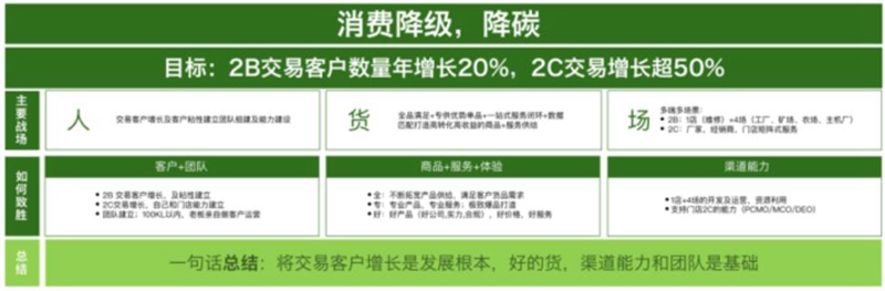 针对“人”的战场,经销商要通过2B交易达到客户增长及粘性建立,通过2C交易促进自己和门店能力建立,同时搭建客户运营团队,建立起客户+团队的运营模式。
