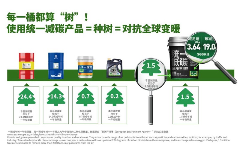 在技术方面,统一则通过自身打造的国家级T-lab低碳润滑实验室,来逐步完成全线产品的低碳升级。据悉,目前旗下所有低碳产品已获得国际权威第三方机构bsi/SGS颁发的碳足迹认证。并在此基础上,统一都为每款产品配备了可视化低碳标签,成为目前润滑油市场当中为数不多可以在全生命周期获得碳足迹、减排量数据的品牌。不仅如此,统一还将每桶产品的减碳量换算成种树的数量,让每位消费者都能够直观地了解自己为地球减碳降温所做出的贡献。