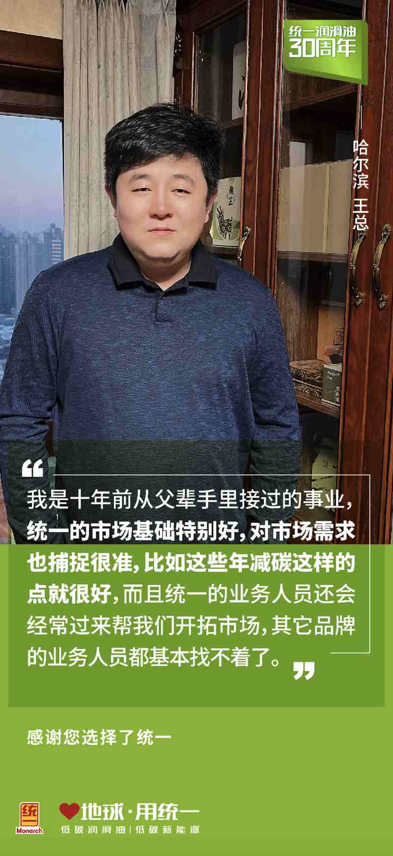 对于统一的低碳品牌战略,王总也表示强烈的认可和支持,在如今全球降碳的大趋势下,还处于蓝海的低碳领域显然有更多的生意机会。“现在客户对低碳的需求也越来越多,摩油的受众越来越年轻化,他们热爱生活,也更注重环保。”王总表示,低碳产品的推广和普及势在必行,我们要尽早出发。正是因为王总对市场的准确把握和前瞻性战略眼光,帮助统一在哈尔滨摩油市场的占有量稳居首位。