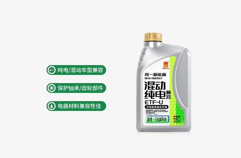 新能源汽车市场中,纯电与混动车型并行发展,但其电驱变速箱面临的工况却更为严苛。不同于燃油车变速箱,新能源电驱系统齿轮转速动辄突破10000转/分钟,且需与高压电机部件近距离接触,对变速箱油的绝缘性、低黏度、抗磨性提出三重严苛要求。文档明确警示“燃油车油液不可通用”,传统变速箱油因无绝缘设计、黏度偏高,不仅无法适配高转速齿轮,更可能引发电机烧蚀、短路等致命故障。针对这一行业痛点,统一推出纯电/混动兼容全合成电驱变速箱油ETF-U,以全维度技术突破,为双能车型提供专业润滑解决方案。
