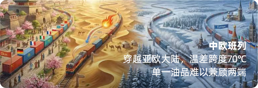 换油周期25万公里,比普通油品延长10万公里。中欧班列从重庆到杜伊斯堡,往返一趟1.1万公里,加一次油能跑10个来回——减少了中途换油的停运时间,更减少了废油排放。