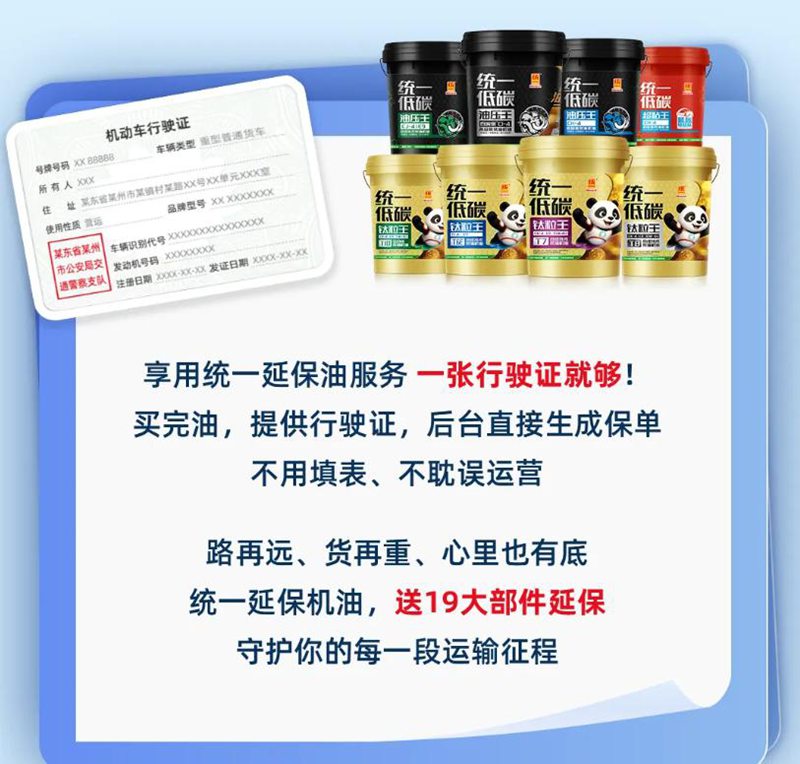 作为积极践行低碳理念的民族品牌,统一润滑油始终以 “以用户为中心” 为初心。统一延保机油的推出,是品牌对用户需求的深度回应,也是对行业生态的积极探索。它不仅为商用车发动机提供了长效、可靠的润滑保护,更以全方位的服务承诺,为用户构建起“技术+保障”的双重护城河。选择统一延保机油,便是选择一种更省心、更高效、更安心的养车方式,让每一次上路都充满信心,让每一段旅程都收获价值。